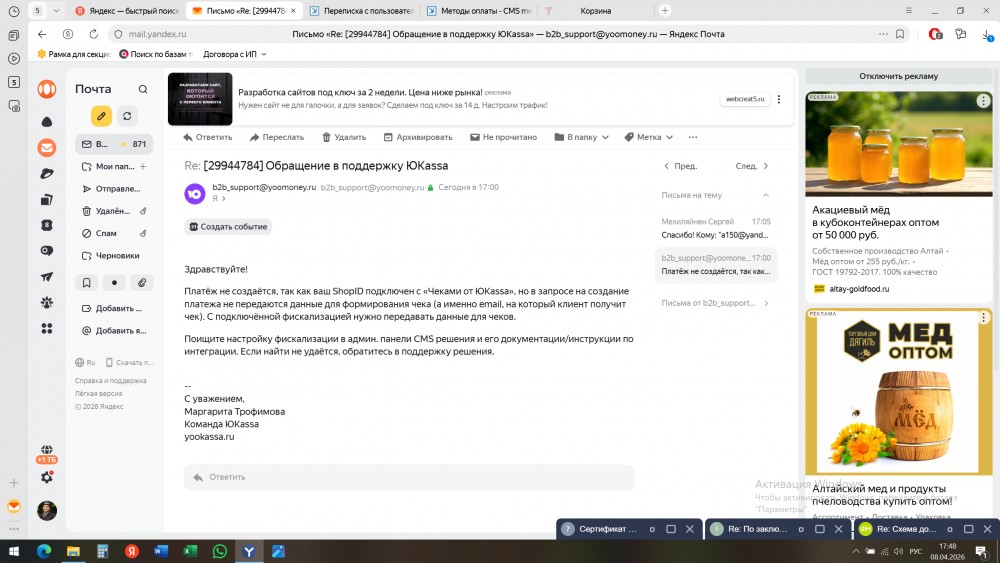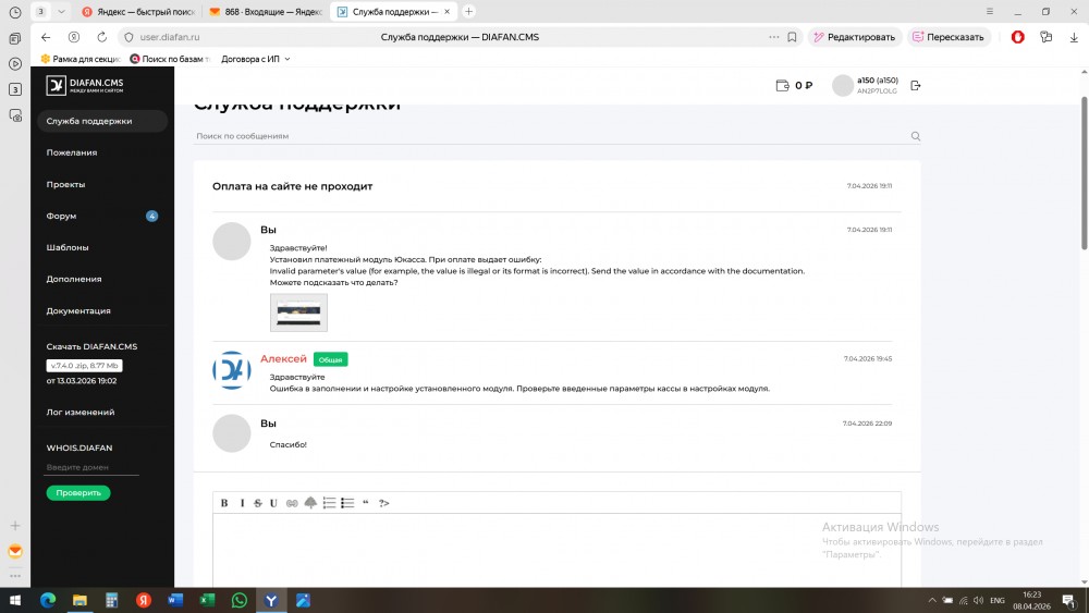 Нужно настроить прием платежей с Юкассой. Сейчас выдает ошибку. Службы поддержки Юкассы и Диафан свое мнение написали. Как всегда все сводится к общей идее: "у нас все ок, это у вас там что-то не так... " В итоге платежи не проходят.